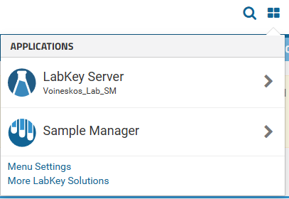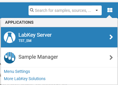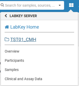 To access LabKey server for a specific study, select the "window pane" icon and chose the LabKey server option from the dropdown menu.