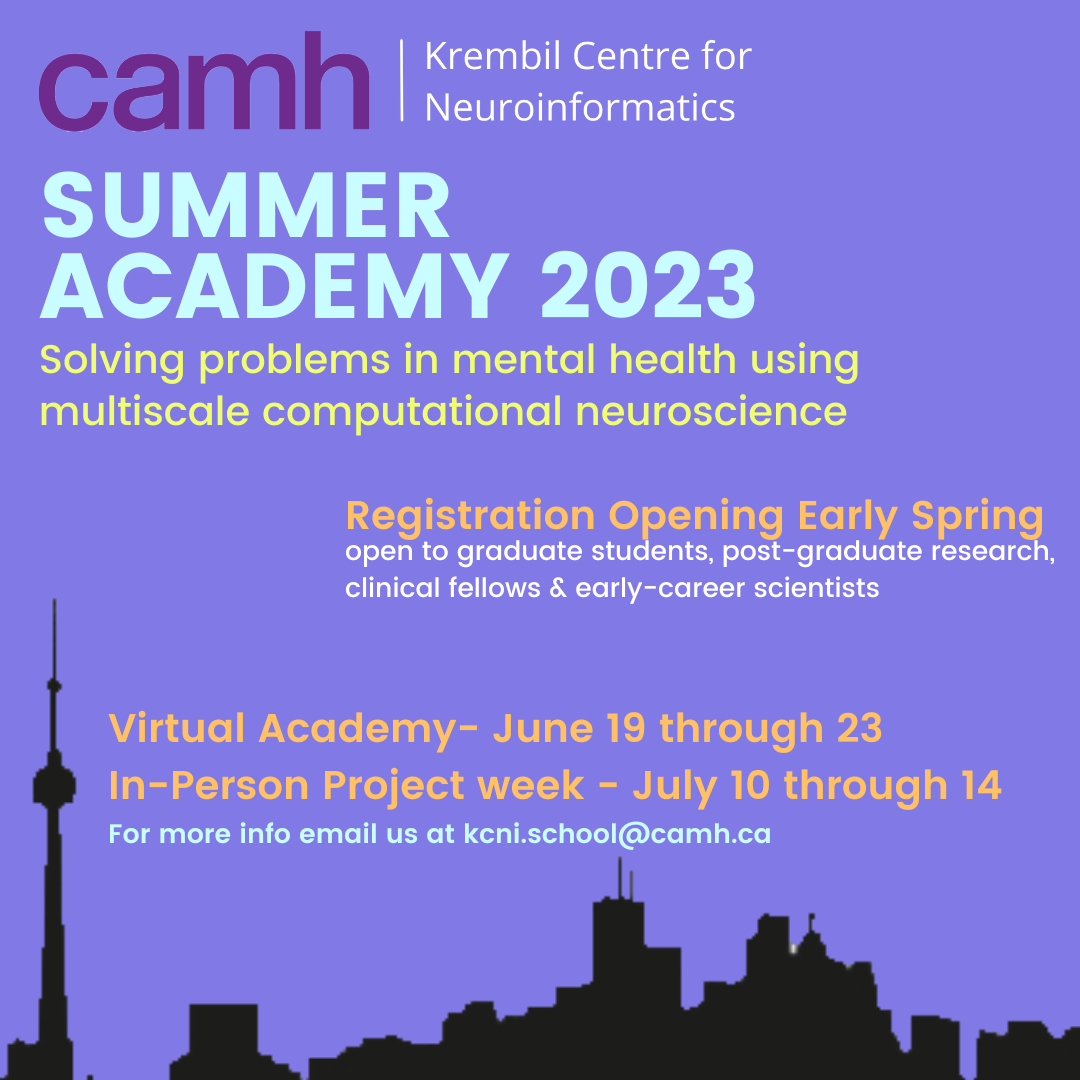 The Krembil Centre for Neuroinformatics is excited to offer a five-day intensive project-based learning week where trainees will learn hands-on techniques for integrating multi-scale neuroscience data. This course is designed to introduce participants to the concepts and methods behind psychiatric neuroinformatics - encompassing genetics, brain structure and function, and cognition. In addition, participants will uncover the links between modalities of human genomics, neuronal electrophysiology, structural and functional neuroimaging, and observed behaviour that KCNI scientists are integrating through a series of virtual modules and a group-based project using real-world data types to study mental illness.