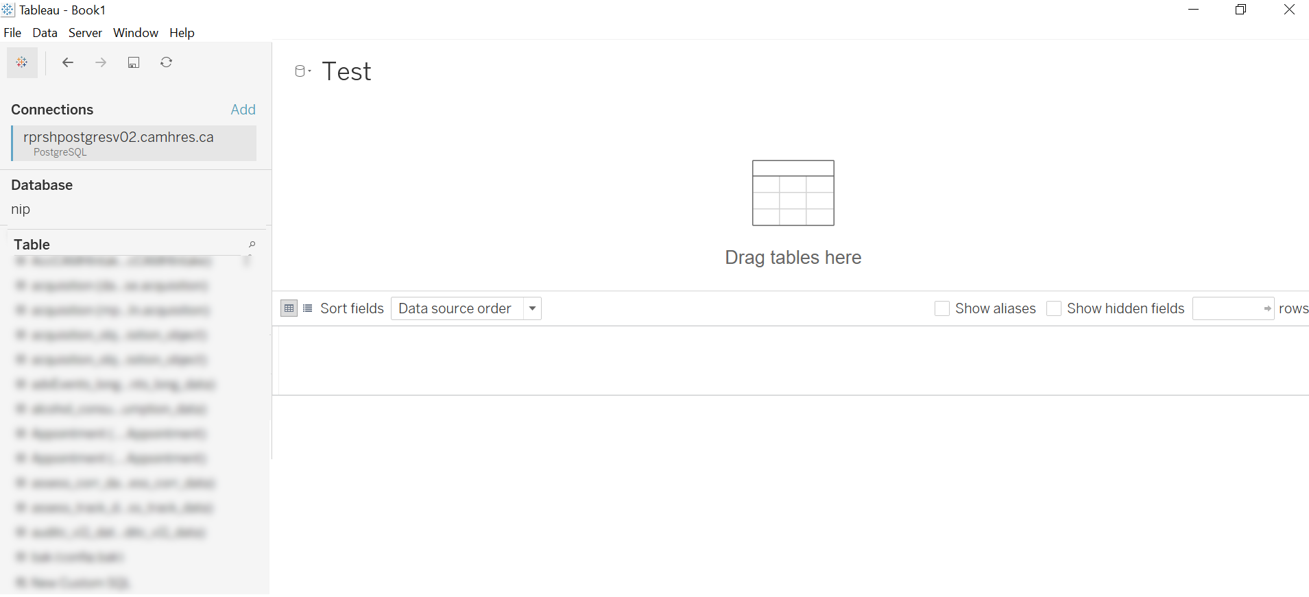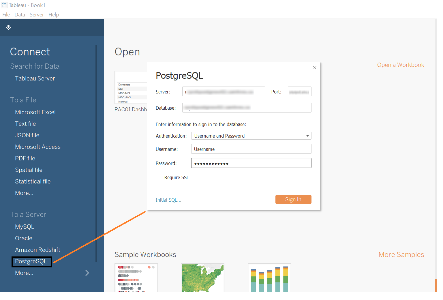- Launch Tableau and go to Connect To a Server and enter the information provided by the NIP team below along with the Username and Password: