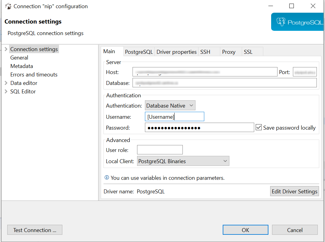 2. Enter the Host, Database and Port information provided by the NIP team along with your Username and Password
